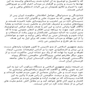 در بیانیه سوم این گروهک آمده است؛ رسانه های وابسته به ارگان های امنیتی رژیم اسلامی با وارونه نشان دادن واقعیات ترور و حذف منتقدین توسط عامل یا عاملین نفوذی خود و همچنین تخریب و تحریف واقعیات موجود، با شتابزدگی منحصر به فرد، کماکان در صدد هستند تا که پروژه های در دست اقدام خود را به پیش ببرند و با شتابزدگی و دستاچگی عوامل اطلاعاتی حکومت ایران، پس از آزادی علی بهمنی، در دسیسه ای تازه در پی تخریب و سناریوسازی علیه نامبرده هستند و…