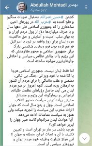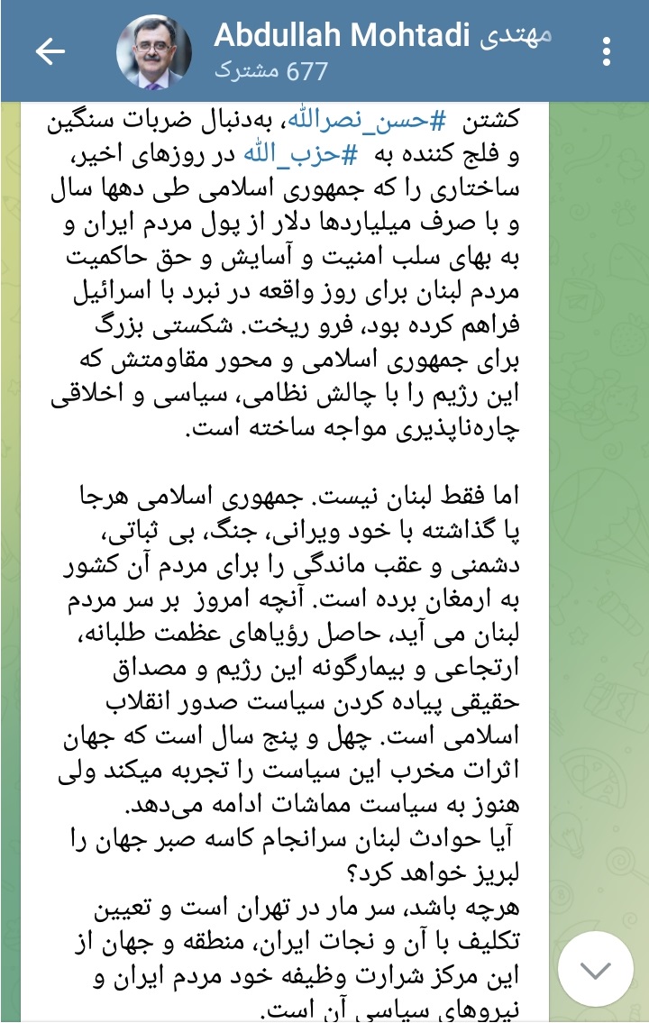 آکام نیوز: پس از حملات وحشیانه رژیم کودک کش اسرائیل به ساکنین غزه و لبنان و کشتار مردم بی دفاع توسط صهیونیست ها، عبدالله مهتدی بجای حمایت از مقتولین، از قاتلین دفاع کرد.