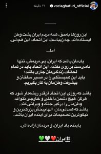غفوری در استوری خود نوشت: «این روزها به حق همه مردم ایران پشت وطن ایستادهاند. چه زیباست این اتحاد، این همدلی. اما…