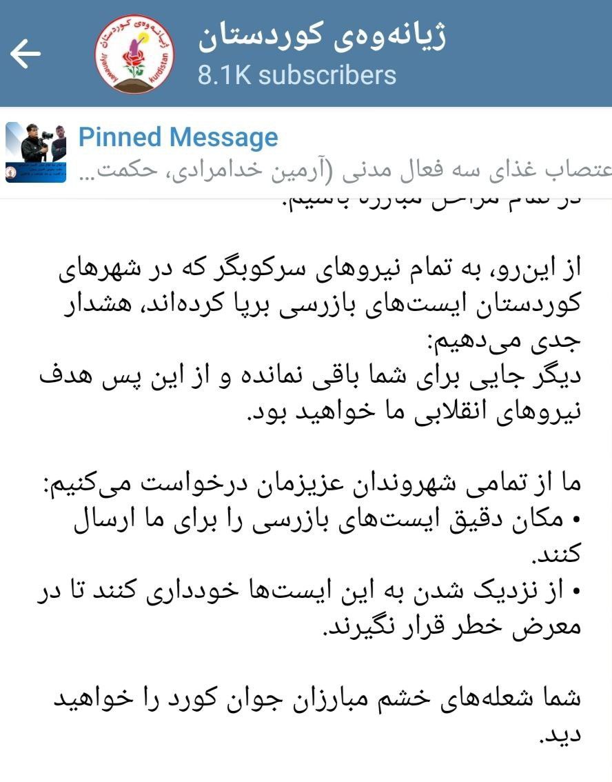 از اینرو، به تمام نیروهای سرکوبگر که در شهرهای کوردستان ایستهای بازرسی برپا کردهاند، هشدار جدی میدهیم: