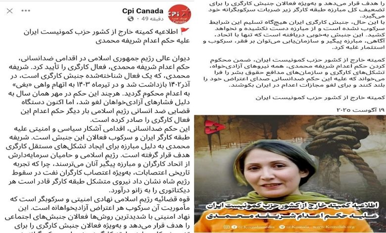 در بخشی از بیانیه حزب کمونیست ایران آمده است؛ شریفه محمدی عضو کمیته هماهنگی برای ایجاد تشکل های  کارگری است.