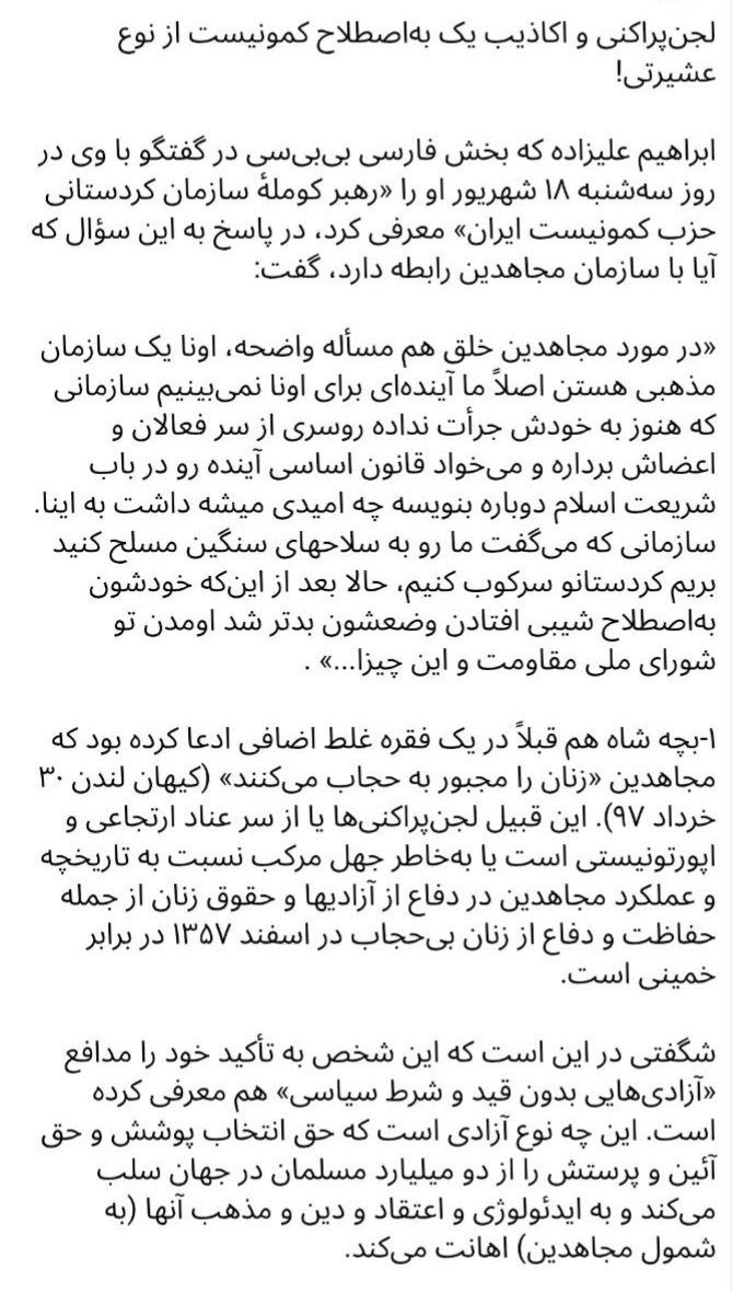 واکنش تند سازمان تروریستی منافقین به اظهارات اخیر ابراهیم علیزاده رهبر کومله کمونیستی در خصوص ماهیت واقعی منافقین/ لجن پراکنی و اکاذیب یک به اصطلاح کمونیست از نوع عشیرتی