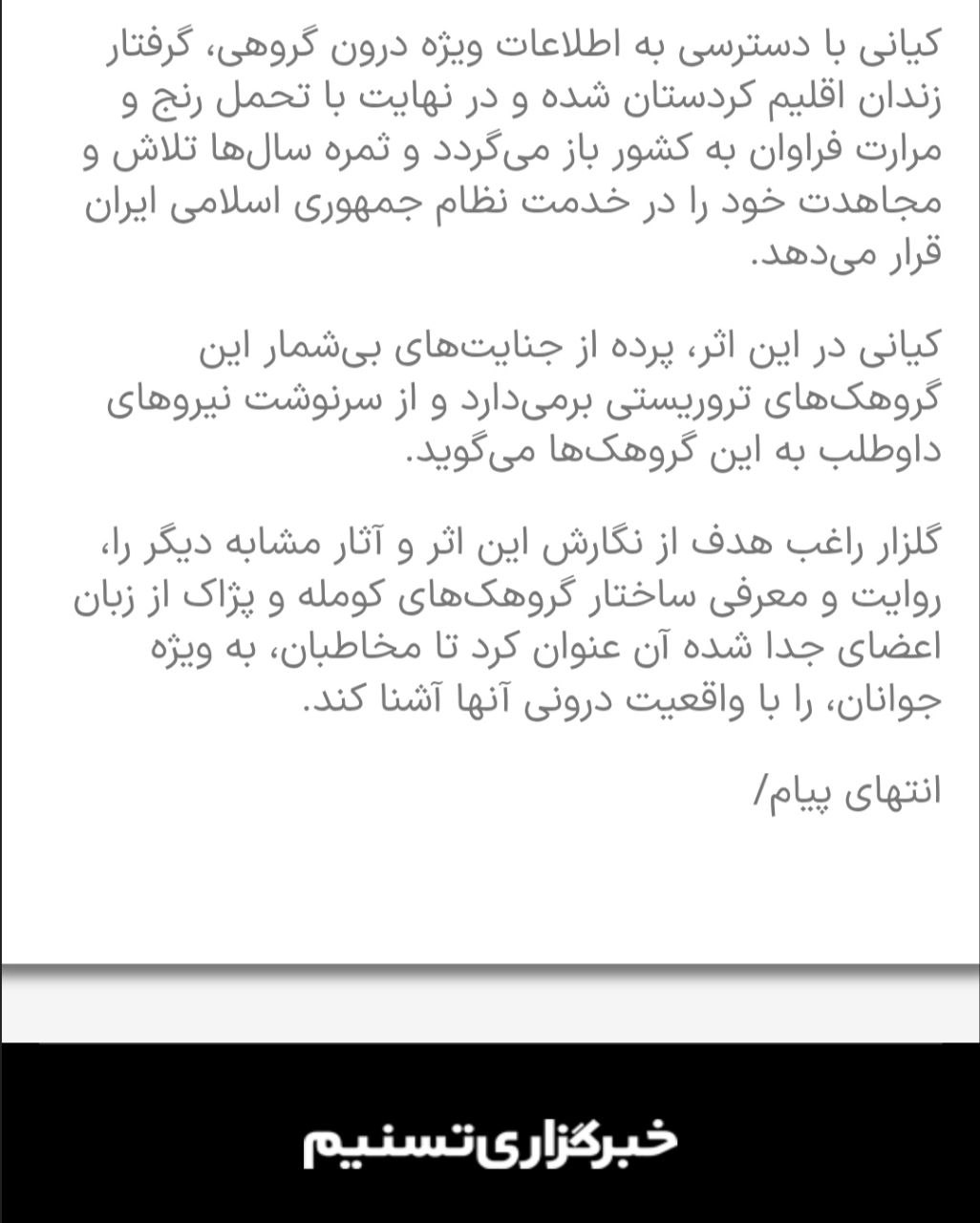 کیانی با دسترسی به اطلاعات ویژه درون گروهی، گرفتار زندان اقلیم کردستان شده و در نهایت با تحمل رنج و مرارت فراوان به کشور باز می‌گردد و ثمره سال‌ها تلاش و مجاهدت خود را در خدمت نظام جمهوری اسلامی ایران قرار می‌دهد.