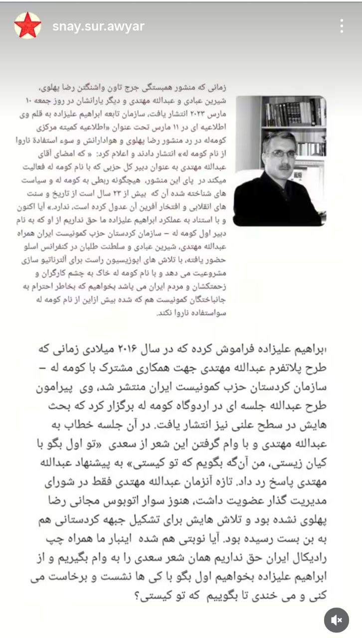 انتقاد صلاح مازوجی سرکرده حزب کمونیست ایران از نشست و برخاست ابراهیم علیزاده با عبدالله مهتدی و سلطنت طلبان