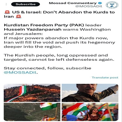 حسین یزدان پناه در توئیتر رسمی موساد، خواستار حمایت اسرائیل و آمریکا از گروهک تروریستی پاک شد/ ما را رها نکنید، به ما کمک کنید!
