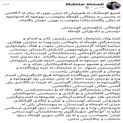 به گزارش آکام نیوز، همانطوریکه در خبر قبلی اعلام کردیم بیش از ۶۱ عضو، کادر، پیشمرگ و عضو رهبری کومله زحمتکشان کردستان به سرکردگی یحیی احمدی عضو رهبری کومله که بیش از دو سال و نیم جاسوس دستگاه امنیتی اقلیم و عبدالله مهتدی بود، از این گروه جدا شدند.