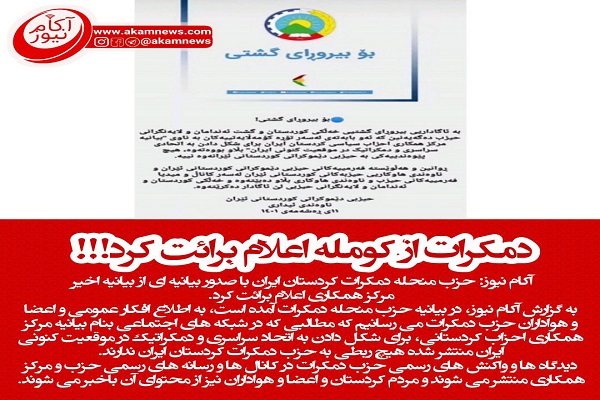 آکام نیوز: حزب منحله دمکرات کردستان ایران با صدور بیانیه ای از بیانیه اخیر مرکز همکاری اعلام برائت کرد.